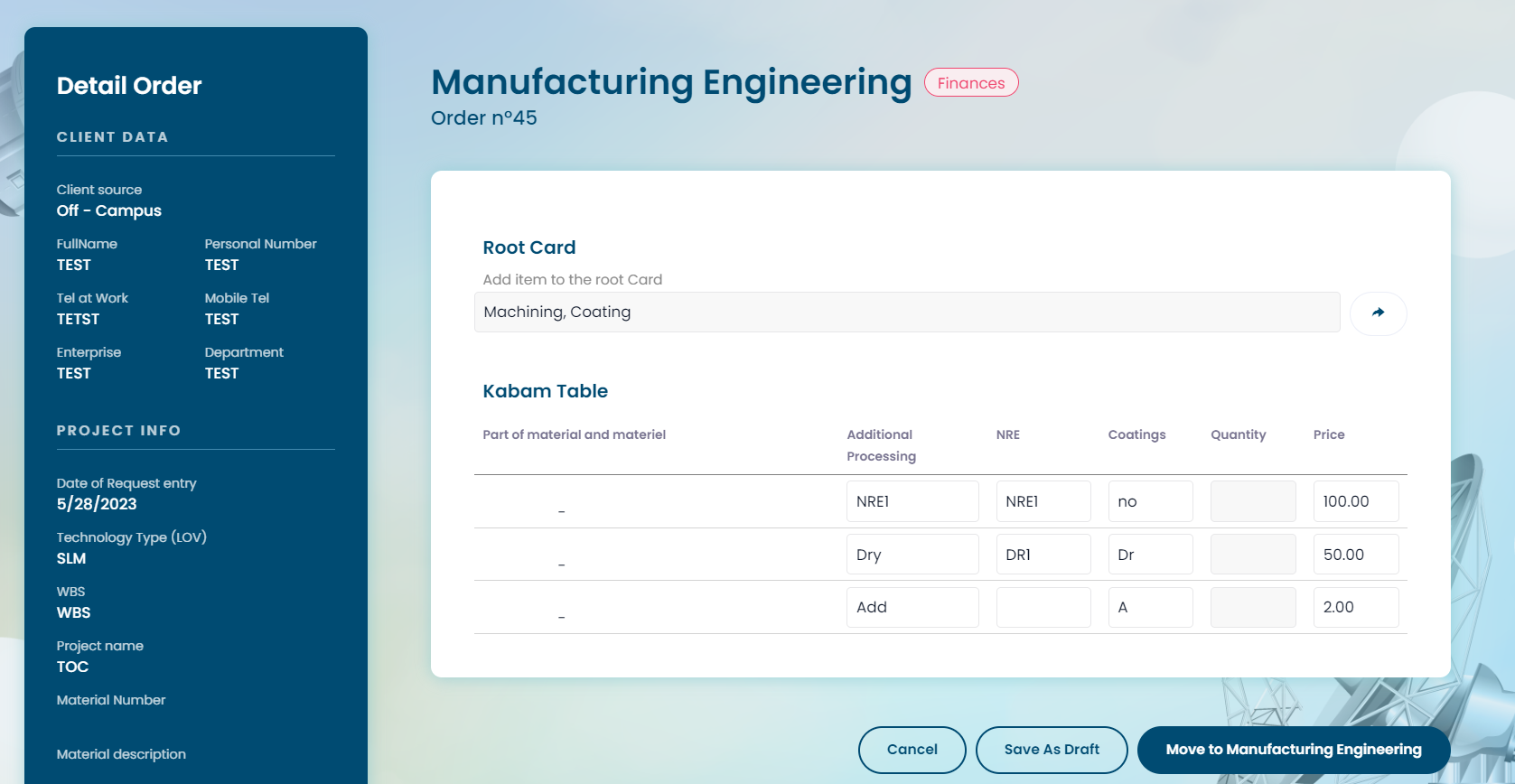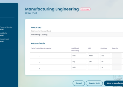 To enhance workflow efficiency, our app includes a streamlined validation process for job requests. It also allows users to enrich the job details, starting from a simple request and progressing through material selection and the breakdown of intermediate pieces. Additionally, it incorporates a financial assessment module, enabling businesses to evaluate the cost implications of each job accurately.